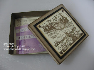 Angler and Warmest Regards (both retired a looooooong time ago). Soft suede, crumb cake, basic black and very vanilla cardstock. Soft suede ink. Lrg. oval punch, scallop oval punch, brads, hemp and dimensionals.