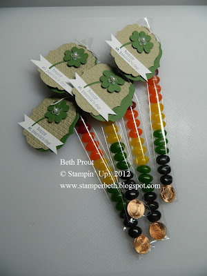 Aren't they cute? I used Skittles jelly beans and they are so yummy! These cello bags were in the last mini catalog but you can still order them. Use number 124134. I think they were $2.95 for 50. Good deal eh?
